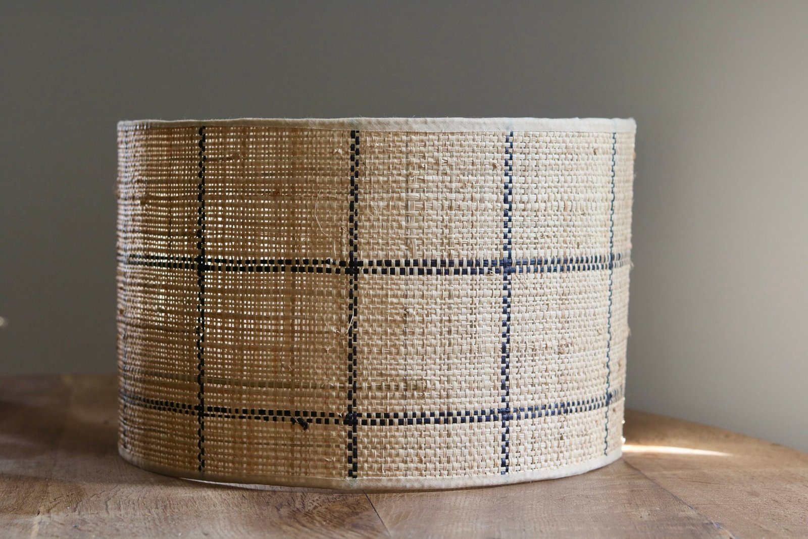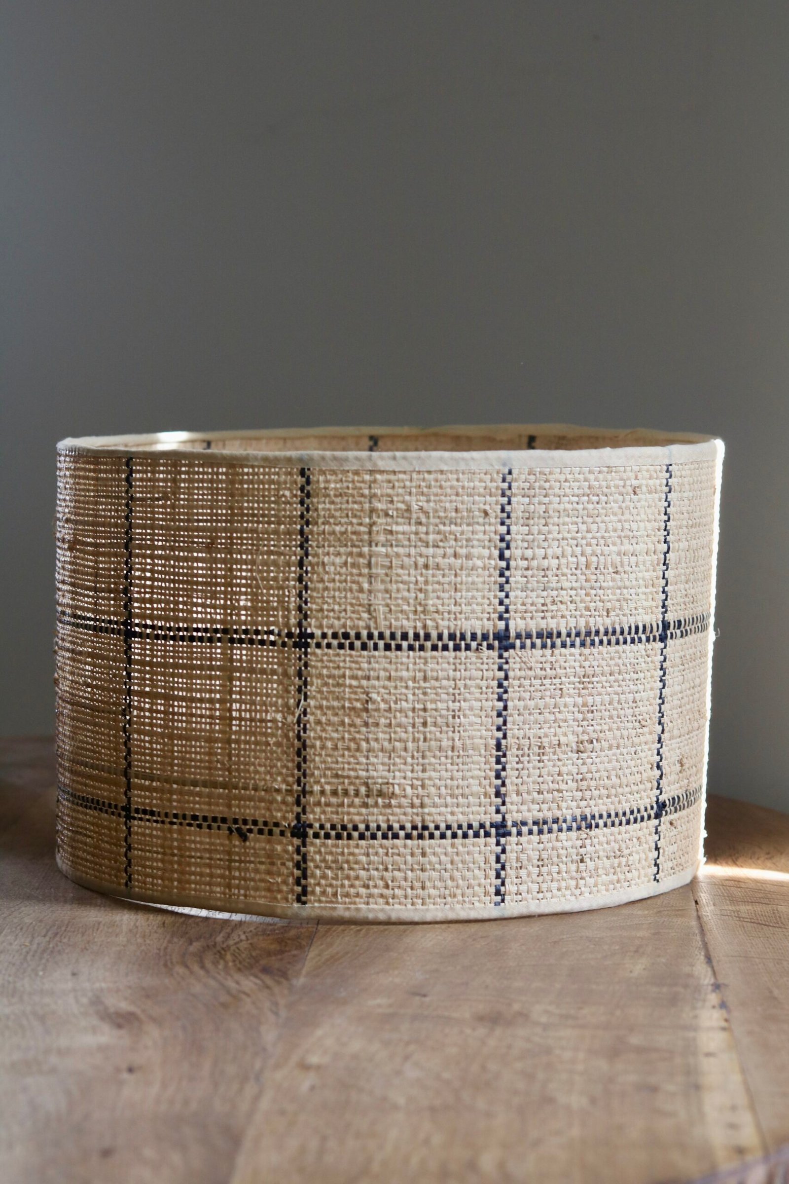 Pantalla cilíndrica para lámpara de mesa o pie. Rafia con dibujo en cuadros negros. Pantalla fabricada a mano en España. Es compatible con bases para lámparas con conexión baja E27.