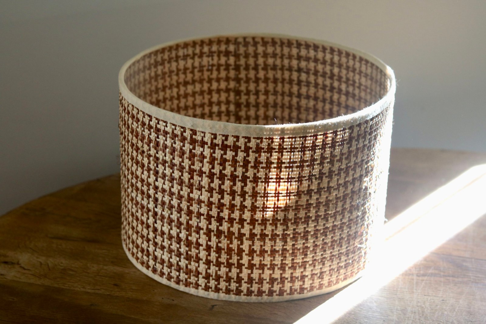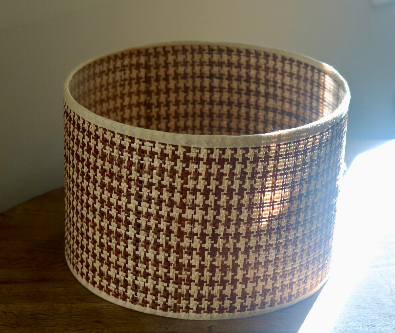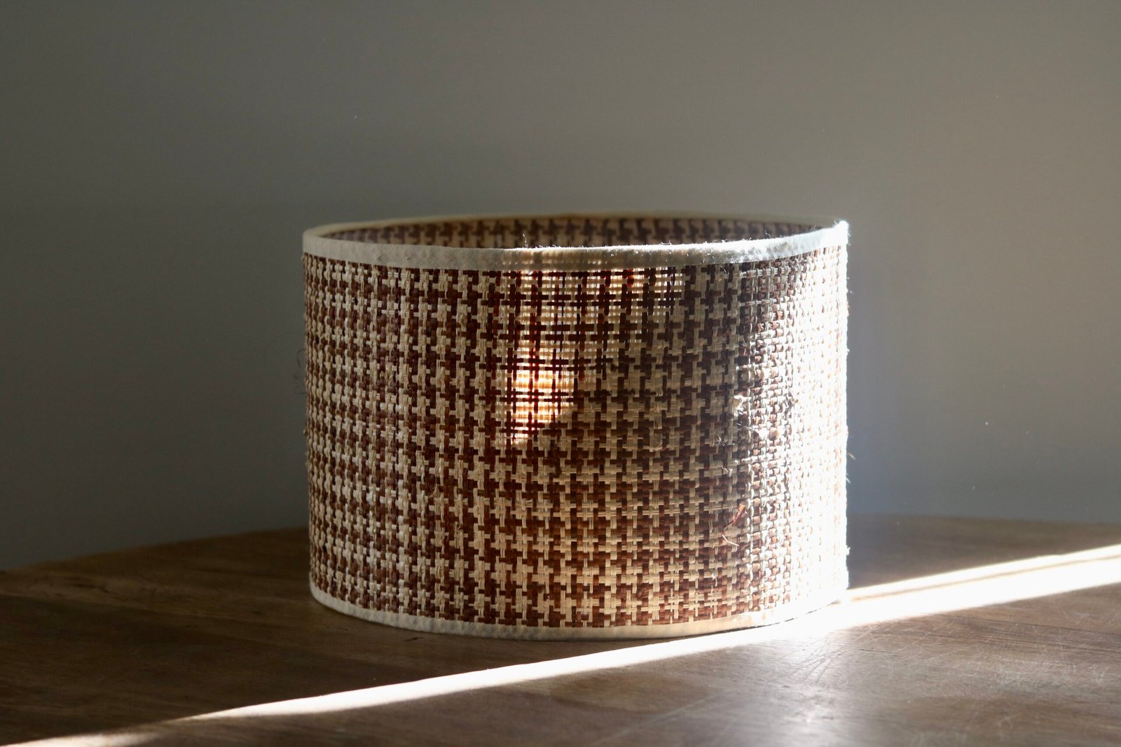 Pantalla cilíndrica para lámpara de mesa o pie en rafia con dibujo pata de gallo en color natural y marrón. Pantalla fabricada a mano en España. Disponible en varios tamaños. Es compatible con bases para lámparas con conexión baja E27.