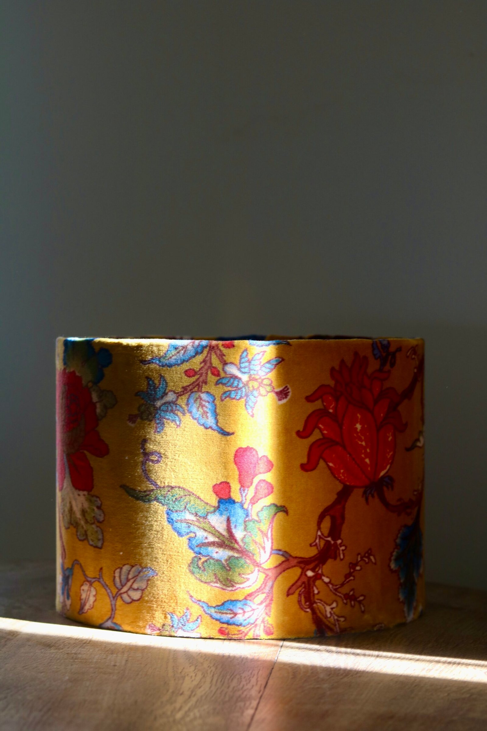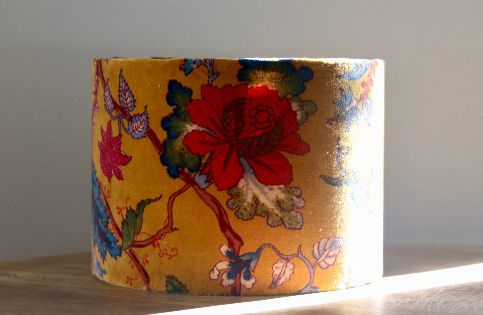 Pantalla cilíndrica para lámpara en terciopelo con estampado flores con fondo amarillo mostaza. Pantalla fabricada en España. Disponible en varios tamaños y con posibilidad de personalización con diferentes colores y tamaño de cinta de terciopelo. Es compatible con bases para lámparas con conexión baja E27.