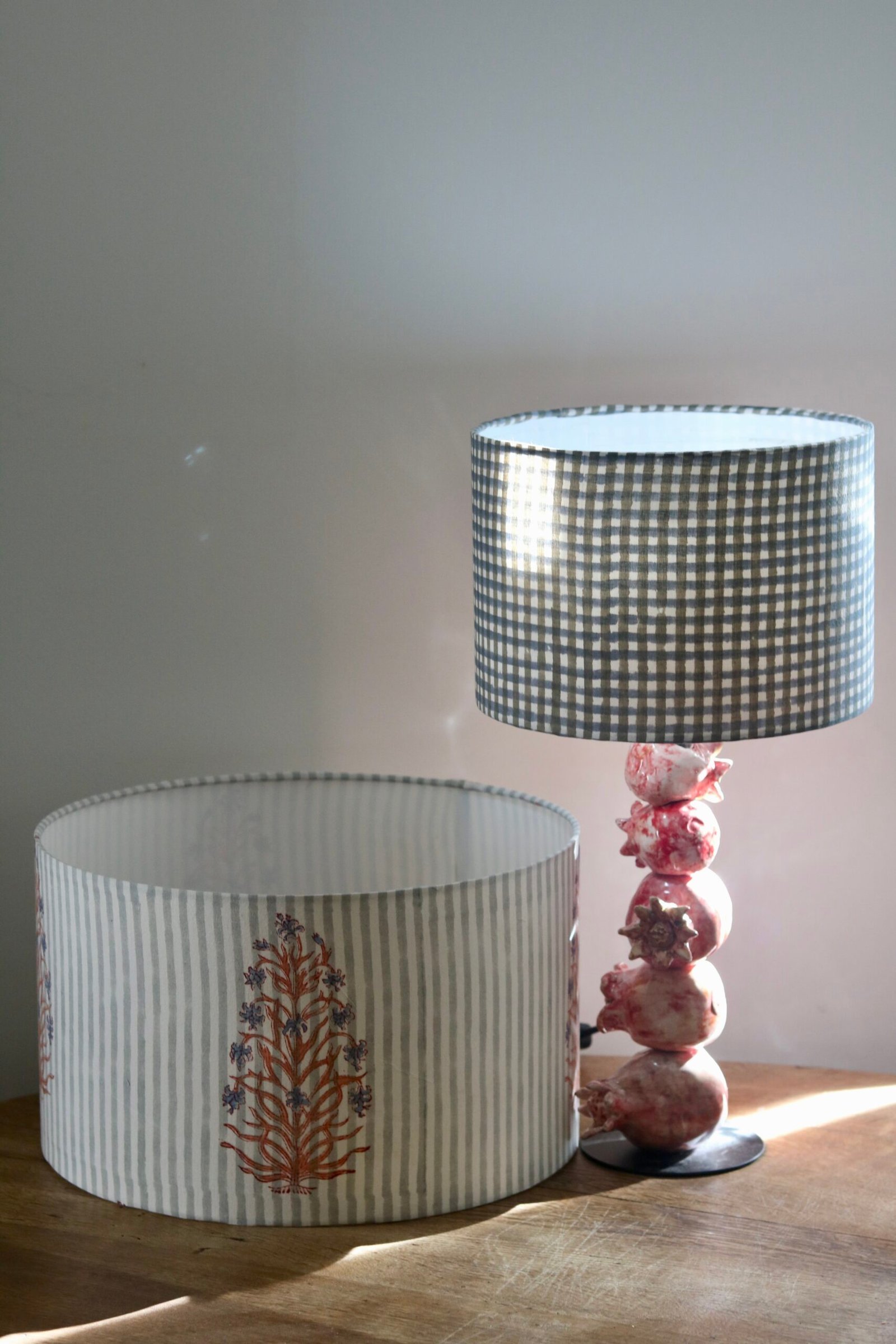 Pantalla cilíndrica para lámpara de mesa o pie. Estampado cuadros azul y gris verdoso. Pantalla fabricada a mano en España. Disponible en varios tamaños y con posibilidad de personalización con diferentes colores y tamaño de cinta de terciopelo. Es compatible con bases para lámparas con conexión baja E27. Composición de la tela 100% algodón